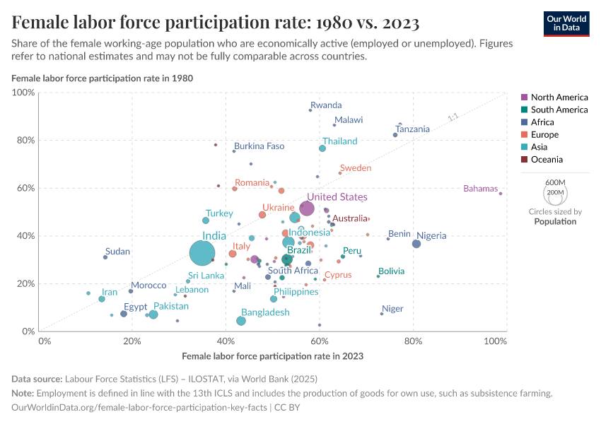 Department of Commerce Census Bureau Current Population Survey CPS Annual Social and Economic Supplement selected years 1975 through 2019. Employment in services of total employment na. Labour force participation rate ages 15 and older female.